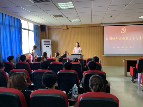 丁玉兰老师向全体党员做简单工作报告并对候选人的历史、工作表现等情况向在座党员进行介绍,最后通过全体正式党员举手表决,表决结果均为全票通过,陈辉、李娇、许卉、符梦娟、高薇四位同志当选为新一届学生第二党支部委员。