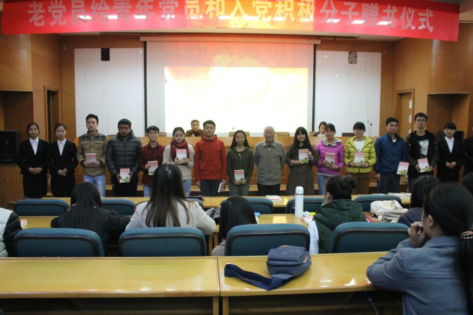 本网讯(通讯员 田依依 孙美佳)2015年11月11日晚7点,太阳成集团tyc151cc于吉首大学沙子坳校区学术报告厅举行老党员李泽南老师给青年党员和入党积极分子赠书仪式。出席此次仪式的有老党员李泽南老师,院党总支副书记曾一凡,辅导员黄弈及我院青年党员和入党积极分子。赠书仪式由辅导员黄弈主持。