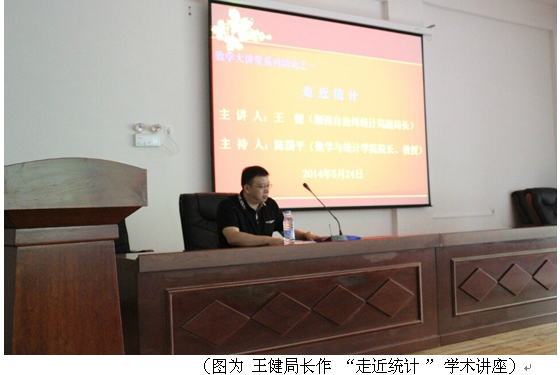 王健分两方面展开“走进统计”主题。一方面以湘西州本身的宏观经济状况为出发点,结合了我国及湘西州周边地市州的经济发展现状,为师生做了一场充实丰富的湘西州最新经济数据运行情况,并对经济数据一一作出解释,挖掘出简单的数字后面殷实的经济故事。另一方面基于湘西州历年的横向纵向序列数据,用 “扩展线性支出系统在城镇居民收支分析上的运用--湘西自治州城镇居民消费潜力研究”、“我州生产总值与固定资产投资周期波动分析”、“我州农村劳动力分化转移进程及效益探析” 三个研究课题为师生分享了统计工作与统计研究相切合的思路。其间我院硕士研究生就相关湘西州宏观经济、城镇化率等相关内容请教了王局长,王局长以求实的精神做解答,赢得全场热烈的掌声。