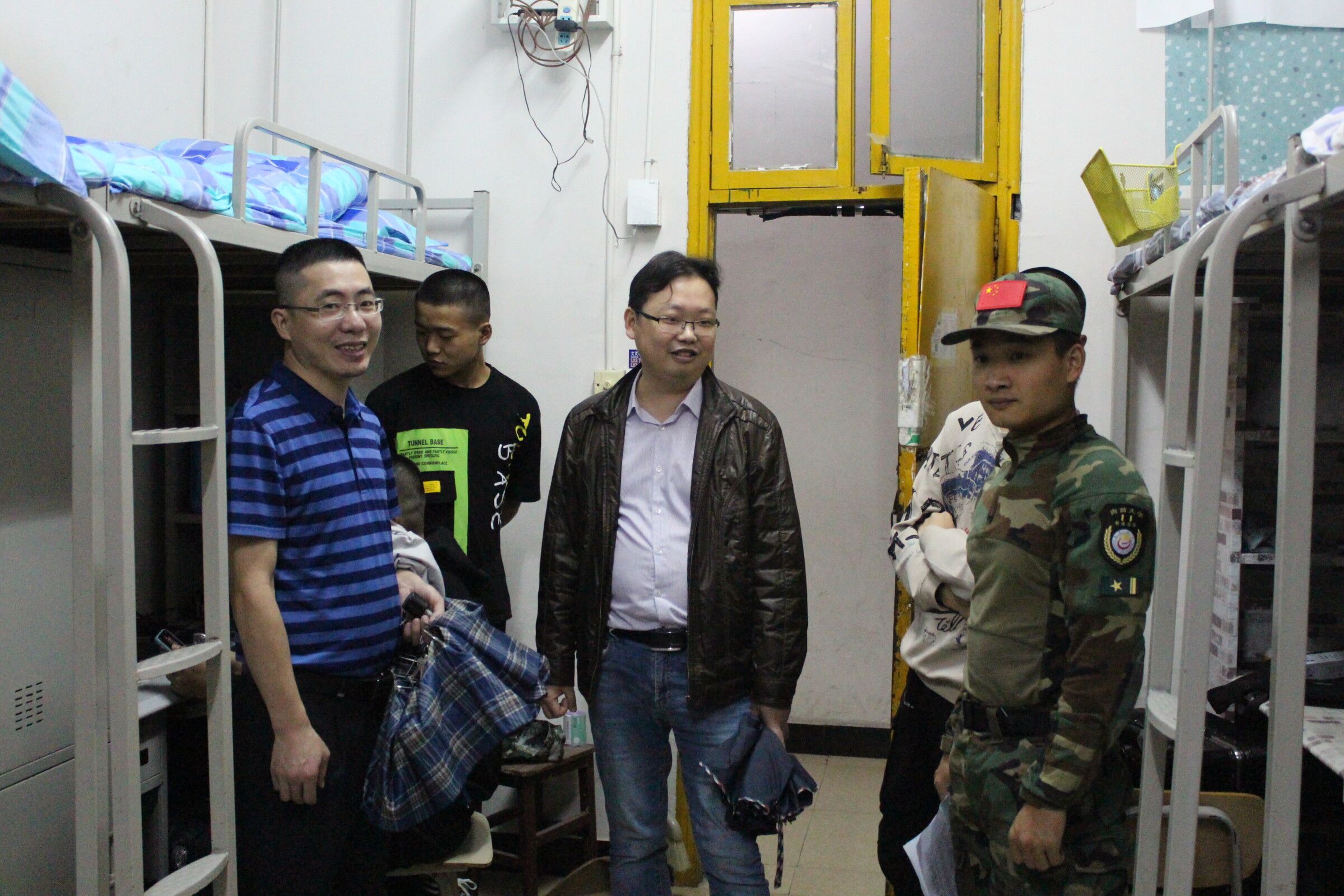 (图为方东辉院长、新生辅导员彭立平走访男生宿舍)