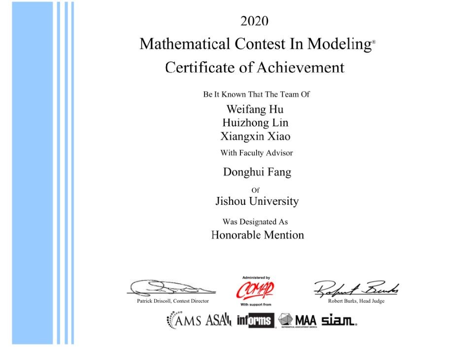 本网讯(通讯员 邵雅欣)4月27日,2020年美国大学生数学建模竞赛成绩公布,我校优秀学子取得佳绩,太阳成集团tyc151cc胡伟芳、林慧中,信息与工程学院肖祥鑫三名同学组成的小组(指导老师:方东辉)经过线上交流、克服重重困难,最终斩获2020年美国大学生数学建模竞赛二等奖。
