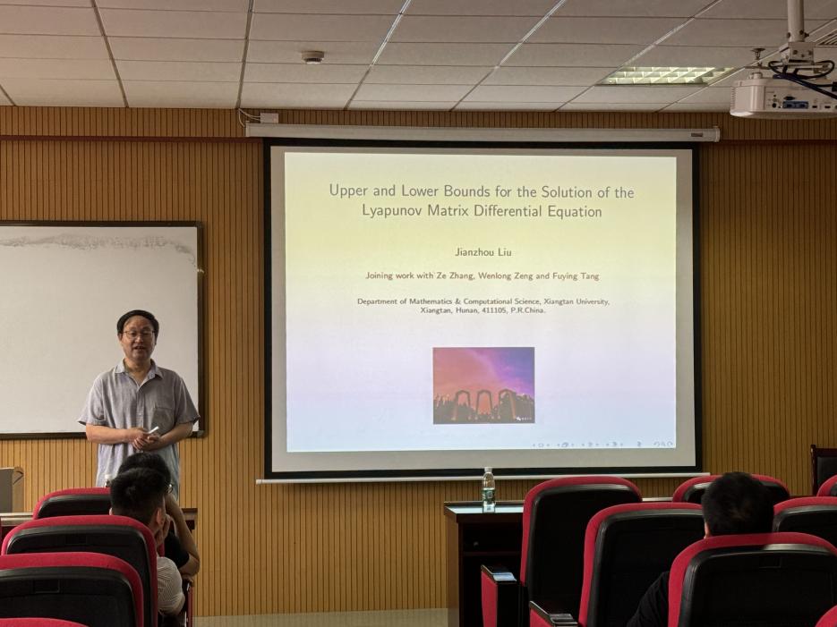 2024年5月11日上午,湘潭大学数学与计算科学学院刘建州教授受邀来我院作学术报告,报告的题目是Upper and Lower Bounds for the Solution of the Lyapunov Matrix Differential Equation。副院长莫宏敏、陈望学、研究生秘书黄家贤和部分研究生参加此次学术讲座,讲座由莫宏敏主持。