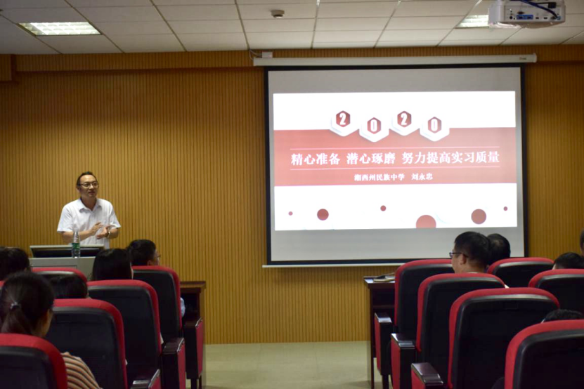 本网讯(通讯员 王美琦)为确保2017级数学与应用数学师范专业实习工作的顺利开展,2020年9月12日我院特别邀请到湘西自治州民族中学刘永忠老师,于总理楼六楼学术报告厅进行题为“精心准备、潜心琢磨、努力提高实习质量”的讲座。院长方东辉、老师陈国平、钟文勇、谢景力、戴厚平、杨乔顺及2017级全体数学与应用数学师范专业学生聆听本次讲座。本次讲座由谢景力老师主持。