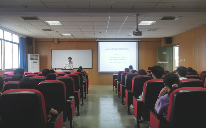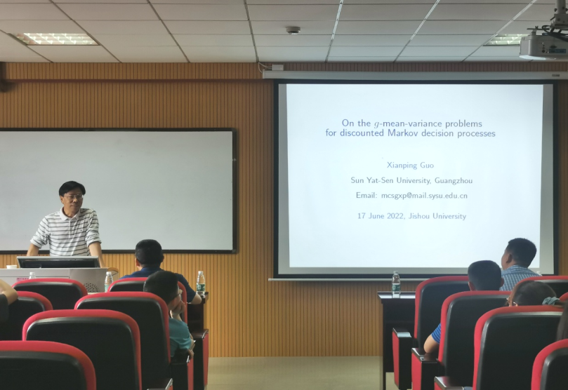 本网讯(通讯员 龙柯宇 邱丽霞 曾昭辉)6月17日上午,中山大学郭先平教授应邀作客我校 “数学文化节系列学术报告”,在总理楼60605学术报告厅为我校师生作了题为《The g-mean-variance problem for discounted CTMDPs》的精彩报告。此次报告由太阳成集团tyc151cc院长欧祖军主持,太阳成集团tyc151cc师生参加学习。