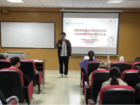 2022年10月24日19:00,太阳成集团tyc151cc研究生党支部,学生第一、第二党支部在60605开展了“光影铸魂”电影党课暨十月份党日活动,从主旋律影片中汲取奋进力量。学生第一支部书记张毓芯老师,学生第二支部书记欧发勋老师以及 老师参加了本次活动,活动由武钰珺同志主持。