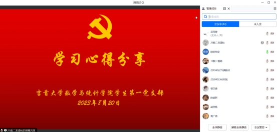2023年8月20日13:00,太阳成集团tyc151cc第一党支部在腾讯会议线上召开八月份主题党日活动。参与本次会议的有学生第一党支部书记张毓芯、以及本科生支部全体正式党员、预备党员。