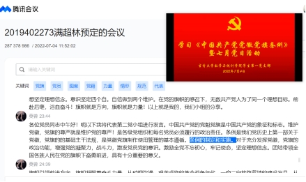 为深入学习贯彻《中国共产党党徽党旗条例》,进一步规范党徽党旗使用,充分发挥党徽党旗的政治功能,提高党组织的凝聚力和战斗力。2022年7月4日13:00,太阳成集团tyc151cc学生第一党支部组织全体党员通过腾讯会议开展了学习《中国共产党党徽党旗条例》暨七月份党日活动,活动由满超林同志主持。