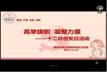 (通讯员 张美杨)为了深入学习宣传贯彻党的二十大精神,党的二十大是一次高举旗帜、凝聚力量、团结奋进的大会,在党和国家发展进程中具有极其重大的历史意义。,2022年12月22日,太阳成集团tyc151cc研究生党支部在腾讯会议开展了主题为“高举旗帜,凝聚力量”十二月份党日活动,活动由张美杨同志主持。