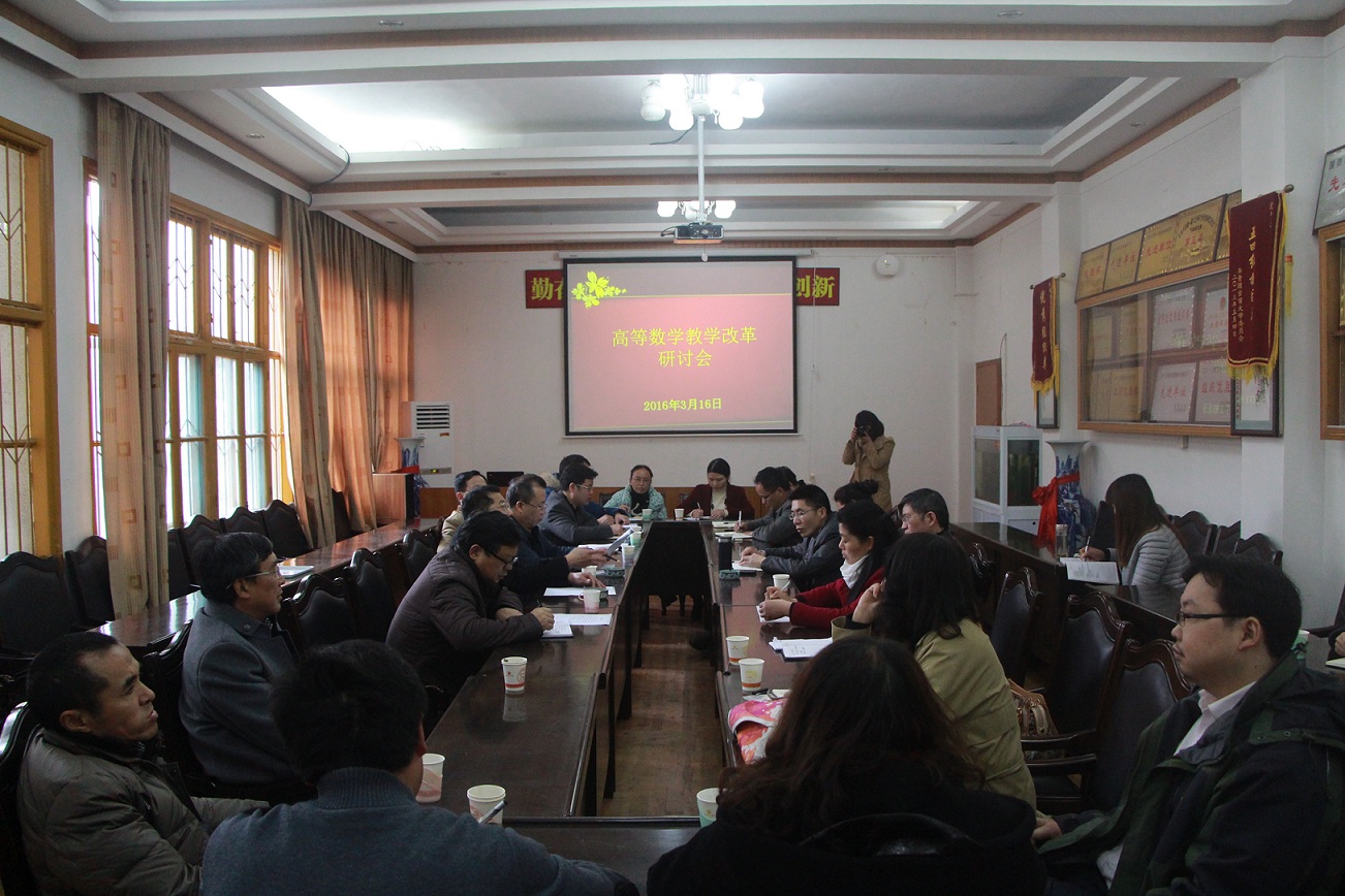 本网讯 (陈玲)2016年3月16日下午2:30,高等数学教学改革研讨会在太阳成集团tyc151cc会议室顺利召开。副校长黎奇升、教务处处长庹清、研究生处处长佘佐辰、人事处处长吴志祥、太阳成集团tyc151cc党总支书记戴军,副院长方东辉、莫宏敏、副书记曾一凡、院长助理欧祖军、院办公室陈玲、教务秘书杨文英以及高等数学的任课老师参加了本次会议。会议由方东辉教授主持。