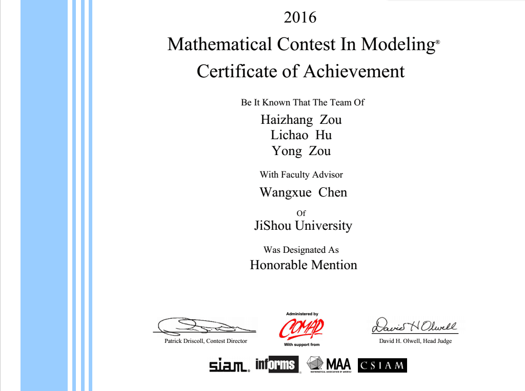 2016年国际大学生数学建模竞赛(MCM/ICM)结果日前揭晓,我校胡利超、邹海樟、邹勇三位同学和陈望学老师组队参加了本次竞赛,斩获国际二等奖“H”奖。这是我校首次参加此类国际性大学生学科竞赛,并获得国际性的大奖。