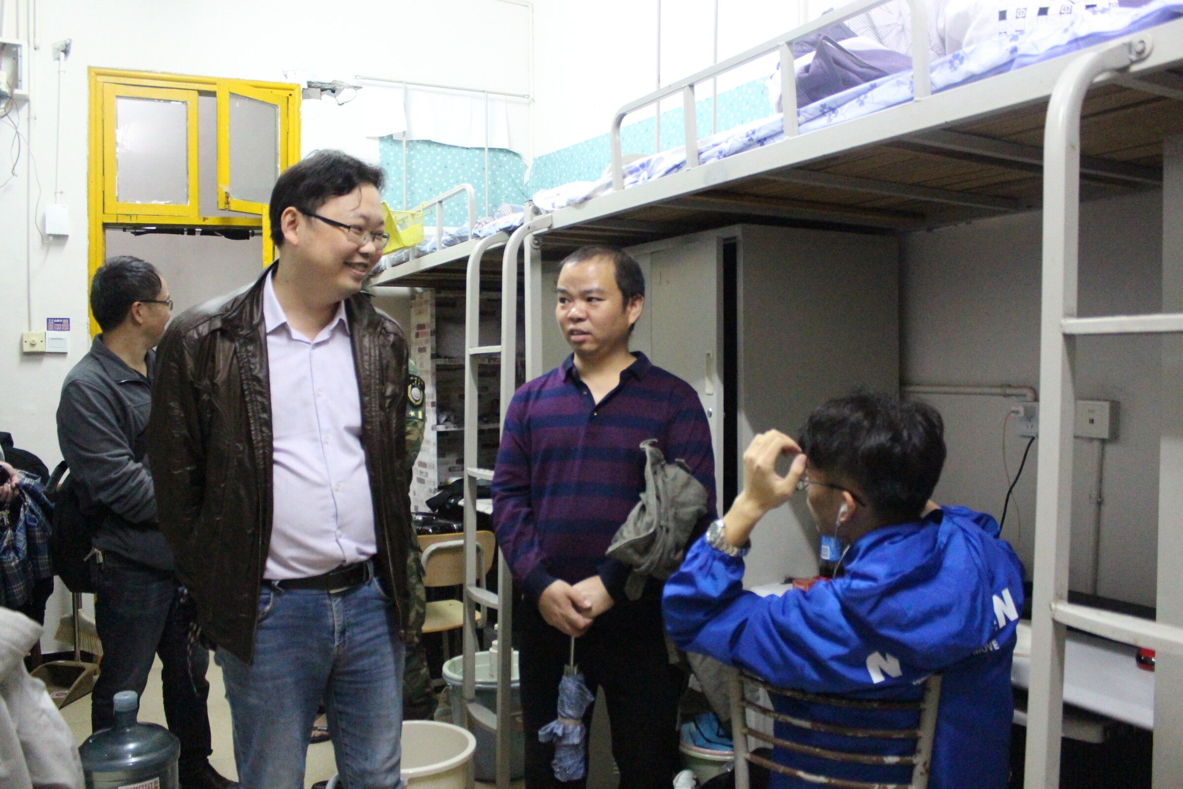 (图为方东辉院长、新生辅导员彭立平走访男生宿舍)