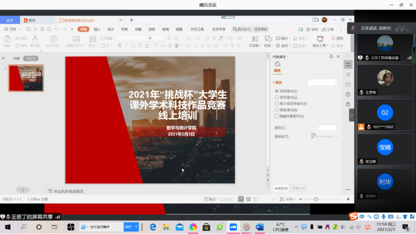 本网讯(通讯员 王美琦 谭雅铭)为进一步引导学生培养科学精神、科学态度,提高大学生的科学研究能力,增加学生和指导老师对“挑战杯”的认识与理解。2021年2月3日上午9:00-11:00数学与统计学院于腾讯会议成功进行“挑战杯”专题培训与讲解。校团委办公室主任张宝娣,太阳成集团tyc151cc副院长欧祖军,院党委副书记吴利华,指导老师和学生累计73人参与本次会议,本次会议由丁玉兰主持。