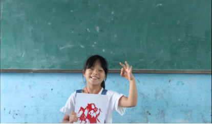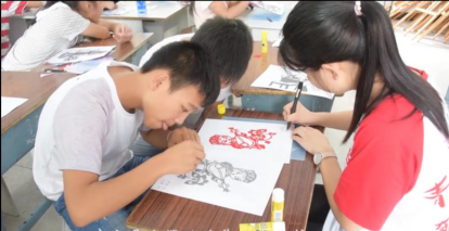 正式开始上课前,老师先将五颜六色的卡纸和手工剪刀分给孩子们,面对这些工具,孩子们都跃跃欲试,想要马上动手制作剪纸。老师先在黑板上展示剪纸的折叠、画图案、展开图,折叠这一步许多孩子都能完成,而在画图案上许多孩子就栽了跟头。老师便在黑板上,画出一个简化并且放大版的图案,给孩子们观看。老师对剪纸的相关知识进行讲解,听完老师讲解剪纸的历史、种类、形式以及技巧后,大兴村的孩子们都兴致勃勃地拿起了剪刀,跃跃欲试。将样稿和红纸固定后,孩子们拿着剪刀,小心翼翼地剪着手中的图案,细致而专注,大家都全身心地投入到剪纸带来的快乐之中。