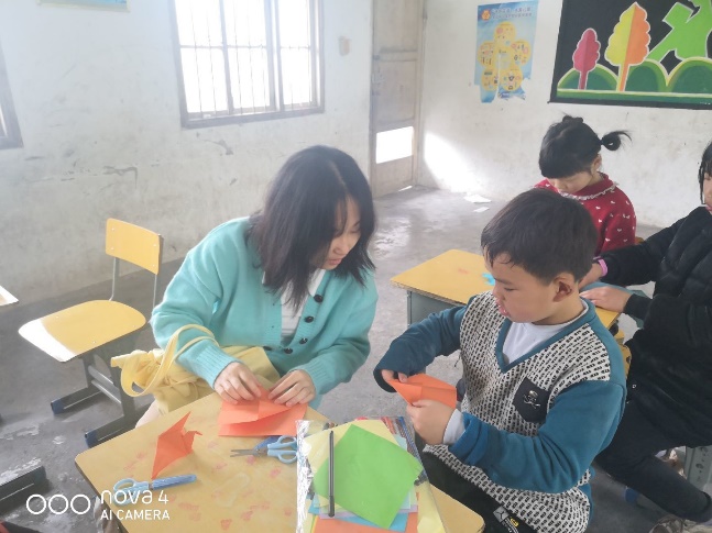 小孩子们都喜欢展现自我,这是一件好事。折纸课上,大家握着剪刀,拿着彩纸,一个个都摆正了神色,仿佛在说,老师,等着我们给你大展身手。有几个不太会的小朋友拽着小老师的衣裳,说要学这个要学那个。大家剪完一份作品便写上自己名字送到老师的面前,眨着乌溜溜的大眼睛等着老师的表扬。慢慢地,大家围在了一块,互相帮助,彼此学习,时间就在这些灵巧可爱的小手上悄然过去。